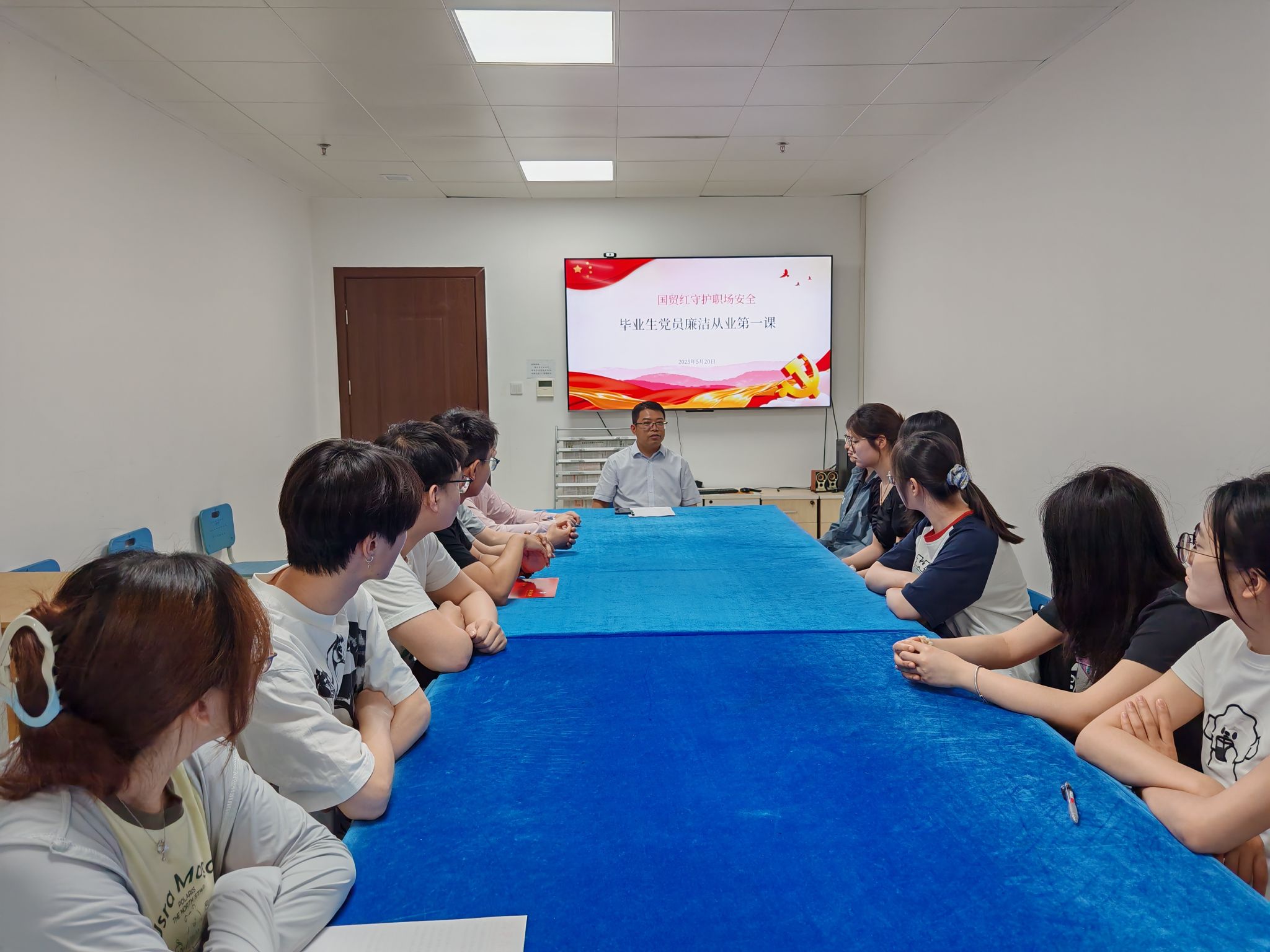 为深入贯彻中央八项规定精神学习教育,强化毕业生党员廉洁自律意识,筑牢拒腐防变思想防线,5月20日,国际经济与贸易学生党支部在西辅楼212开展“国贸红守护职场安全”毕业生党员廉洁入职教育。学院党委书记杜小明、学生党支部书记王天云及全体支部毕业生党员参加会议。