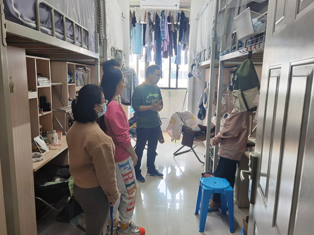 走访期间,辅导员们查看了学生的住宿条件,提醒同学们要注意开窗通风,生活物品排放整齐,养成良好的生活习惯,共同营造良好的宿舍氛围,宿舍长要提醒宿舍成员排查宿舍安全隐患的同时也要关注舍友的身心健康情况。心理负责老师宋志华向所走访宿舍学生提出了几点要求:一是宿舍成员之间应相互谅解、相互帮助;二是注重细节,多关心身边同学的一言一行;三是适当开展宿舍集体活动,增进舍友之间的感情。被走访宿舍学生表示,感谢老师们的到来,并对老师们的关心十分感动,走访在欢声笑语中进行,相处十分融洽。同时,辅导员们也不忘关心同学们的学业状况,与同学们深切交流,逐一解答同学们在学业方面的疑惑,为同学们指明前进的方向。
