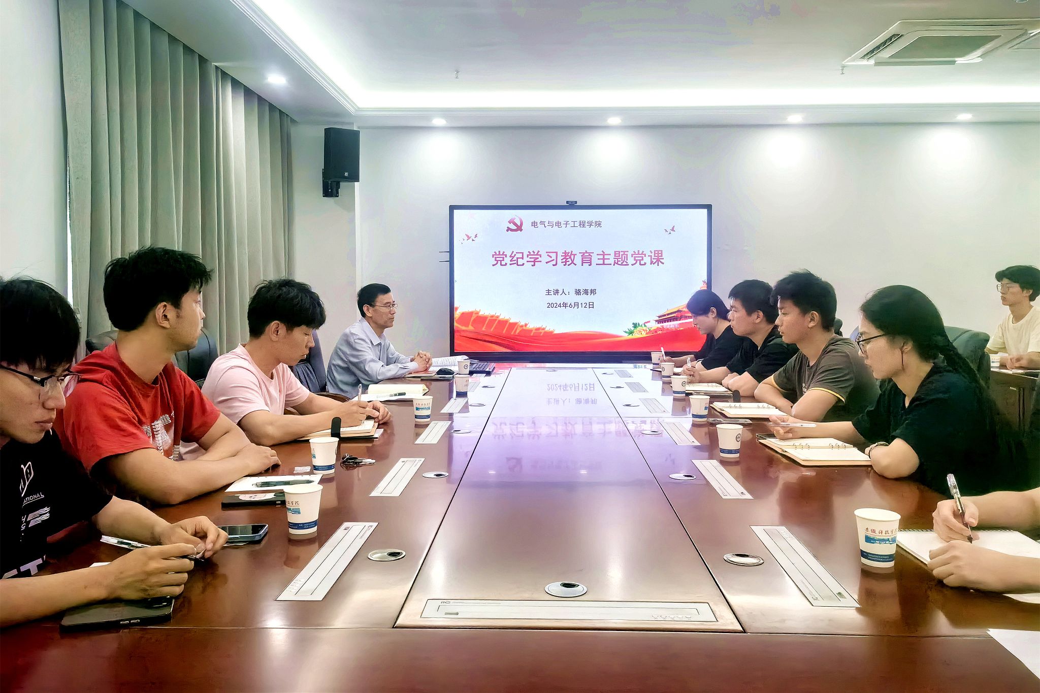 为推动党纪学习教育走深走实,6月12日下午,电气与电子工程学院在西辅楼317会议室开展党纪学习教育专题党课。党课由学院党委书记骆海邦主讲,学院组织员张深主持。学院学生党员代表以及部分入党积极分子参加活动。
