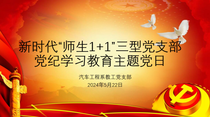 汽车工程系教工党支部联合车辆与农业装备专业学生党支部于5月22日在笃行楼409开展党纪学习教育主题党日活动,此次活动聚焦新时代基层党组织建设,以师生“1+1”三型党支部模式开展,旨在深入开展党纪学习教育,推动师生共同学习党纪,教育引导党员学纪、知纪、明纪、守纪,提升教育效果。