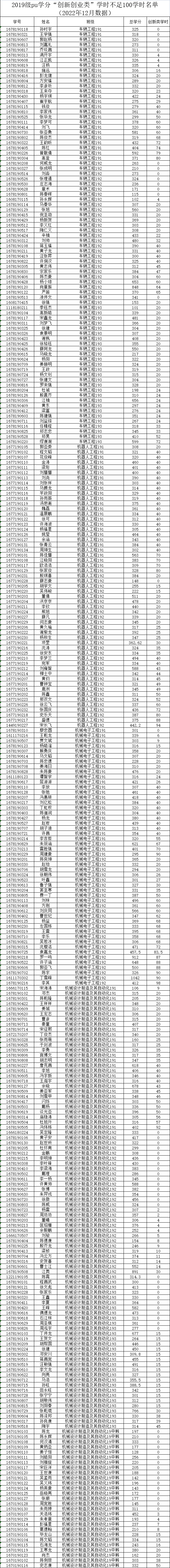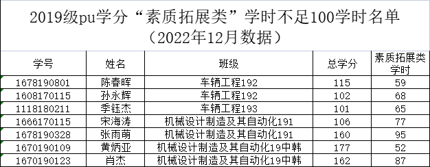 机械工程学院2022-2023-1学期二课堂学分(PU)未达标名单公示(2019级)