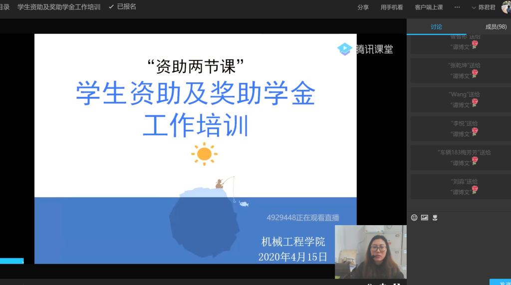 4月15日下午,机械工程学院通过腾讯课堂对班级学生干部和学生组织学生干部进行云端“资助两节课”培训,培训内容围绕“学生资助及奖助学金工作”展开,学院200余名学生干部线上参加培训。