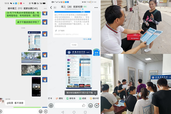 本次活动由我组成员负责,本次活动分为四个部分:一,联系本届高考生或者毕业班老师分享招生宣传资料电子档;二、我组成员各自联系以前的班主任,看望班主任并向班主任汇报自入大学以来的生活和成长;三、在砀山中学校园内进行现场宣传,包括海报的张贴、宣传折页的发放、为考生解疑答惑播放我校招生视频等;四、同我校负责来砀山中学招生的老师一道,在高招会上为前来的学生及家长解疑答惑,分享我们在安科学习和生活的日常。