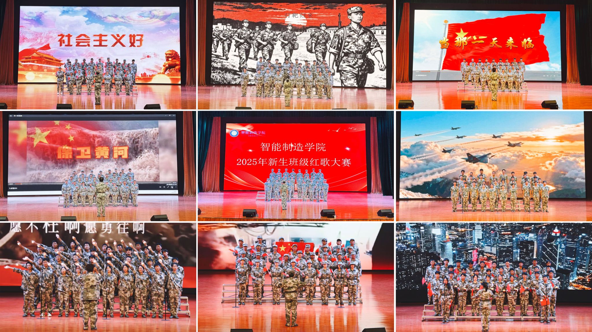 自大赛筹备以来,27个新生班级积极响应,利用军训下训时间精心组织彩排,打磨参赛作品。比赛现场,参赛班级逐一上台展示,唱响《没有共产党就没有新中国》《保卫黄河》《歌唱祖国》《我和我的祖国》《灯火里的中国》《万疆》《当那一天来临》等27首经典红色和军旅歌曲,并以队形创意、手语演绎、深情朗诵等形式传递赤子之心。激昂旋律唤起了全场对盛世中华的自豪,铿锵歌声彰显了保家卫国的坚定信念,温情曲调串联起个人与祖国命运,磅礴气势彰显了中华民族不屈的抗争精神。全程展现出新时代大学生的团结协作、蓬勃向上的精神风貌,让青春理想与红色信仰相融辉映。