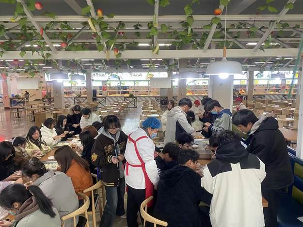 活动现场气氛热烈,同学们摩拳擦掌,准备大展身手。一张张餐桌上摆满了食堂师傅们提前精心准备好的饺子皮和馅料,同学们分工协同,迅速投入到紧张而有序的包饺子环节。有的同学手法娴熟,一捏一按之间,一个饱满圆润的饺子便呈现在大家眼前;有的同学发挥创意,捏出各种形状、造型独特的饺子,把美好的祝愿与寓意包进饺子;也有不少同学则是在食堂工作人员或者其他同学的帮助下,学习每一个步骤,努力追赶上其他人。大家互相帮助,相互学习,经过一番努力,形态各异的饺子纷纷成型。随后,在食堂工作人员的帮助下,一锅锅热气腾腾的饺子端上餐桌,空气中弥漫着阵阵香味。同学们围在餐桌前,品尝着自己的劳动成果,互相聊着校园生活中的点点滴滴。