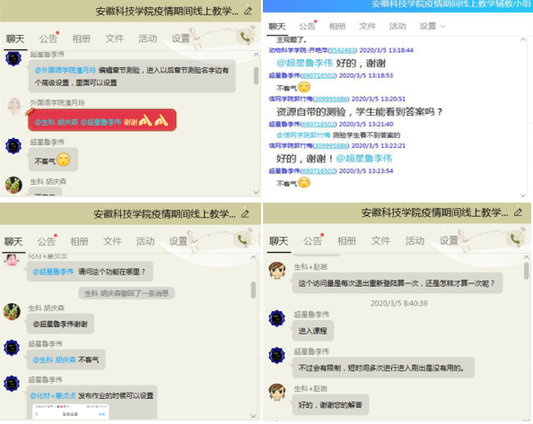 爱心关怀,教学相长。针对在线教学中学生遇到的各种问题,教师们及时跟踪,竭尽所能予以解决。对于自主学习能力较弱的学生,逐一交流,循循善诱,激发学习兴趣。对于自主学习能力较强和要求较高的同学,线上“开小灶”,不厌其烦,逐一辅导,解疑答惑。学校对学生线上学习流量给予补助,每名学生按20元标准补助,对于家庭经济困难学生按40元标准补助,家庭经济特别困难学生按60元标准补助。生命与健康科学学院王晓鹏老师推进学习共同体,互相帮助,互相督促,共同考核。很多同学在讨论和反馈环节中比较各直播平台优劣,绘制了网络流畅度时间表。
