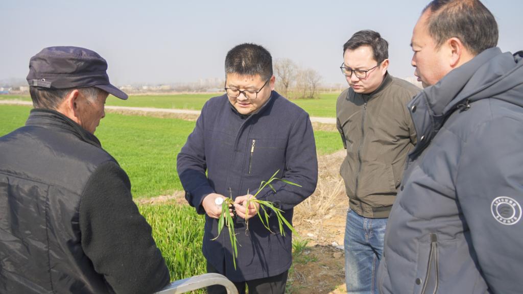 李文阳一行深入田间地头查苗情、田情、病虫草情,认为李楼乡、马城镇小麦目前生长整体良好,针对不同长势田块指导农户进行因苗分类管理,主要田管措施为,一是追好肥,做到“一追三防”;二是喷好药,防治纹枯病等;三是针对少量有草害田块,拔节前尽早进行化除。同时针对播量过大、播种过早、整地质量较差、播后未镇压等造成的苗弱,提出了针对性建议。
