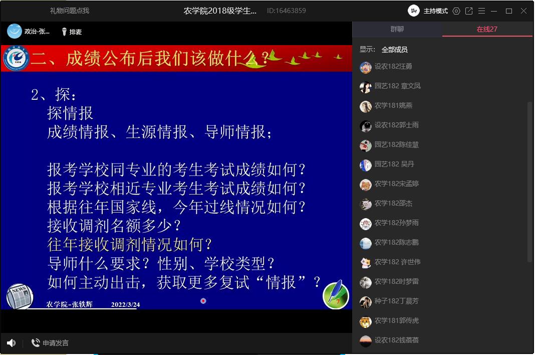 张轶辉借助历年研究生复试面试经典案例,从“如何看待初试成绩、成绩公布后我们该做什么、如何准备复试面试、如果没被录取怎么办”等四个方面详细介绍了复试面试相关环节关键内容。辅导紧扣农学院学生实际,举例丰富,生动形象,并与同学们进行了线上交流解惑,气氛热烈。