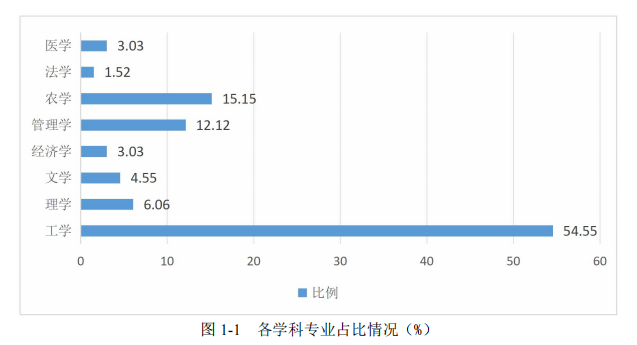 学校现有本科专业66个,涵盖8个学科门类,其中工学专业36个,占54.55%;理学专业4个,占6.06%;文学专业3个,占4.55%;经济学专业2个,占3.03%;管理学专业8个,占12.12%;农学专业10个,占15.15%;法学专业1个,占1.52%;医学专业2个,占3.03%,形成了以新兴工科和优势农科为重点,多学科相互支撑、协调发展的学科专业群,应用型专业布局结构基本形成(见图1-1)。申请撤销物流工程、农艺教育、经济学、电子科学与技术、编辑出版学、审计学、信息与计算科学和信息安全8个专业。